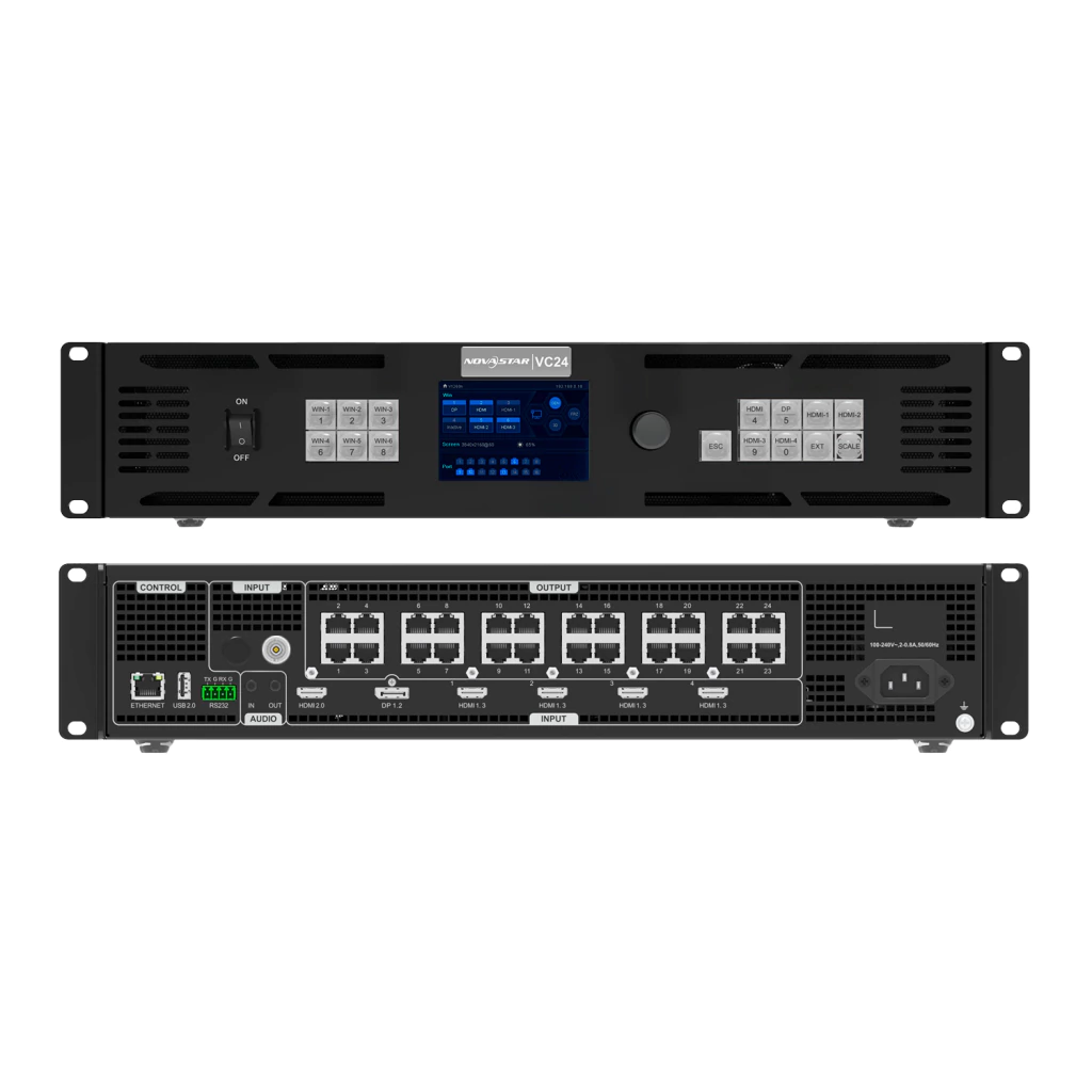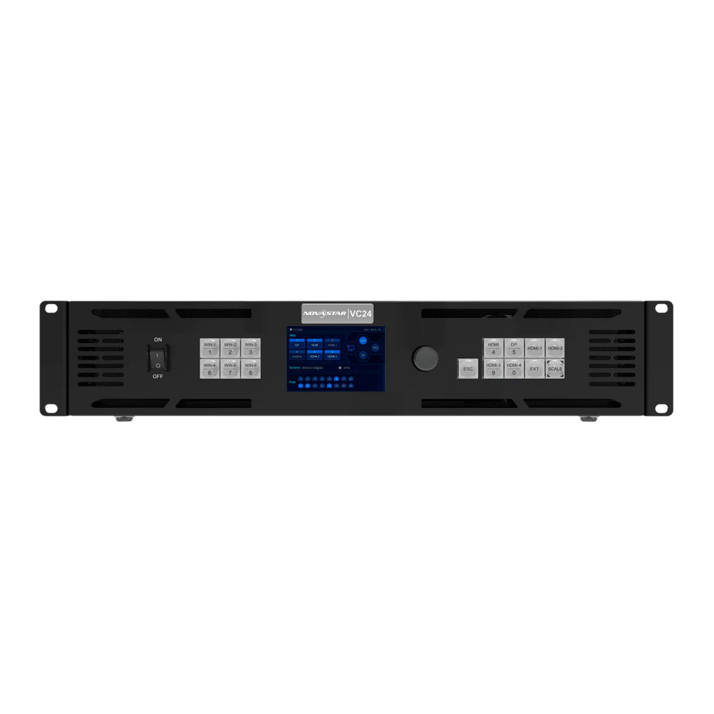 El VC24 es un controlador todo en uno de NovaStar que integra procesamiento y control de video en un solo dispositivo, ofreciendo una capacidad de carga excepcional y soporte para señales de ultra alta resolución. Con 24 puertos Ethernet y compatibilidad con múltiples entradas 4K, es ideal para grandes pantallas LED, videowalls y aplicaciones profesionales en eventos, centros de control y señalización digital.